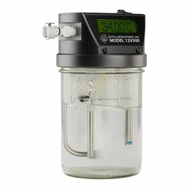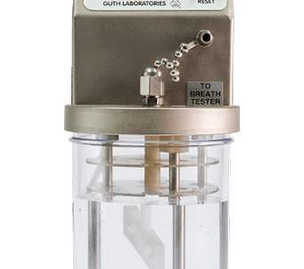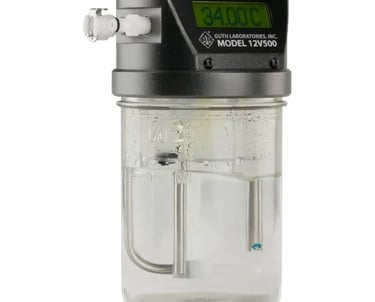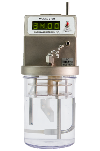 is a State-of-the-Art, electronically temperature controlled, water-alcohol instrument for the purpose of providing a precise calibration standard for testing or calibration of alcohol breath analyzers. The Model 12V500 is the first simulator of its kind to incorporate dual temperature probes to independently control and monitor the temperature of the solution. The temperature of the water-alcohol solution placed in the simulator is maintained at 34°C ± .05°C or better. The inlet and outlet port pathways have been designed to be an integral part of the one piece heated aluminum top housing thus allowing uniform heating and reduction of condensation. The new LCD graphics display has a temperature resolution of .01° C and in the event of an error allows feedback to the user in the form of messages instead of codes. As with all Guth products the 12V500 has been engineered using the highest quality components to give reliable, accurate and trouble free operation.